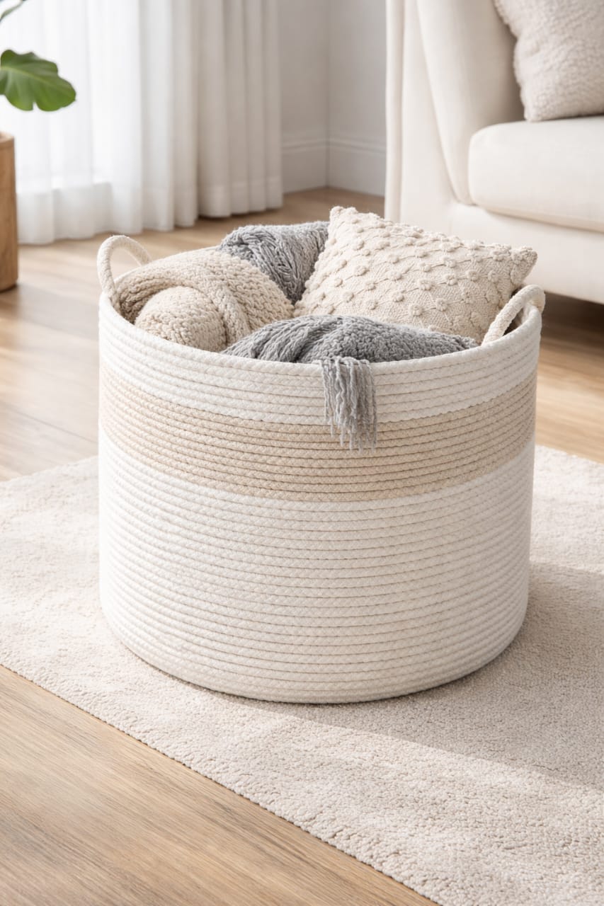 Durable woven storage basket for organizing clothes, toys, towels, or household items.